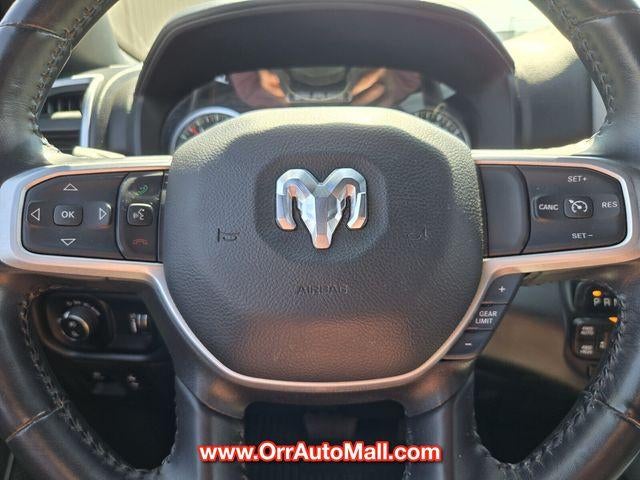 Bed Utility Group (MOPAR 4 Adjustable Cargo Tie-Down Hooks, MOPAR Deployable Bed Step, MOPAR Spray In Bedliner, and Pick-Up Box Lighting), Big Horn Level 2 Equipment Group (115V Auxiliary Power Outlet, 115V Auxiliary Rear Power Outlet, 2nd Row In Floor Storage Bins, 400W Inverter, 4G LTE Wi-Fi Hot Spot, 8.4" Touchscreen Display, Air Conditioning ATC w/Dual Zone Control, Apple CarPlay, Auto-Dimming Exterior Driver Mirror, Auto-Dimming Rear-View Mirror, Black Exterior Mirrors, Black Premium Power Mirrors, Bluetooth® Handsfree Phone & Audio, Class IV Receiver Hitch, Cluster 7.0" TFT Color Display, Connectivity - US/Canada, Convex Wide-Angle Mirror Insert, Exterior Mirrors Courtesy Lamps, Exterior Mirrors w/Heating Element, Exterior Mirrors w/Supplemental Signals, For Details, Visit DriveUconnect.com, Global Telematics Box Module (TBM), Glove Box Lamp, Google Android Auto, GPS Antenna Input, Heated Front Seats, Heated Steering Wheel, Integrated Center Stack Radio, Media Hub w/2 Charge Only USBs, ParkSense Front/Rear Park Assist w/Stop, Power 2-Way Driver Lumbar Adjust, Power 8-Way Driver Seat, Power Adjustable Pedals, Power-Folding Mirrors, Radio: Uconnect 5 W w/8.4" Display, Rear Dome w/On/Off Switch Lamp, Rear Power Sliding Window, Rear Window Defroster, Remote Start System, Security Alarm, SiriusXM Radio Service, SiriusXM Satellite Radio, Sun Visors w/Illuminated Vanity Mirrors, Universal Garage Door Opener, and USB Host Flip), Quick Order Package 23Z Big Horn (Big Horn Badge), 3 Rear Seat Head Restraints, 4 Way Front Headrests, 4-Wheel Disc Brakes, 48V Belt Starter Generator, 6 Speakers, ABS brakes, Air Conditioning, Alloy wheels, AM/FM radio, Brake assist, Bumpers: chrome, Cloth Bench Seat, Compass, Connected Services Delete Credit, Delay-off headlights, Driver door bin, Dual front impact airbags, Dual front side impact airbags, Electronic Stability Control, Emergency communication system: SiriusXM Guardian, Front anti-roll bar, Front Center Armrest w/Storage, Front fog lights, Front License Plate Bracket, Front reading lights, Front Seat Back Map Pockets, Front wheel independent suspension, Fully automatic headlights, Heated door mirrors, Illuminated entry, Integrated Voice Command w/Bluetooth®, Leather steering wheel, Low tire pressure warning, Manufacturer's Statement of Origin, MOPAR Front & Rear Rubber Floor Mats, Occupant sensing airbag, Outside temperature display, Overhead airbag, Overhead console, Panic alarm, ParkView Rear Back-Up Camera, Passenger door bin, Passenger vanity mirror, Power door mirrors, Power steering, Power windows, Radio data system, Radio: Uconnect 3 w/5" Display, Rear 60/40 Folding Seat, Rear anti-roll bar, Rear seat center armrest, Rear step bumper, Rear Wheelhouse Liners, Remote keyless entry, Speed control, Split folding rear seat, Steering wheel mounted audio controls, Tachometer, Telescoping steering wheel, Tilt steering wheel, Traction control, Trailer Brake Control, Trip computer, Variably intermittent wipers, Voltmeter, Wheels: 18" x 8" Cast-Aluminum Painted, and Wheels: 20" x 9" Aluminum Chrome Clad (WRK)