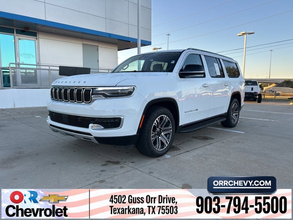 10 Speakers, 3.55 Rear Axle Ratio, 3rd row seats: bench, 4-Wheel Disc Brakes, ABS brakes, Adjustable pedals, Air Conditioning, Alloy wheels, AM/FM radio: SiriusXM with 360L, Anti-whiplash front head restraints, Apple CarPlay/Android Auto, Audio memory, Auto-dimming door mirrors, Auto-dimming Rear-View mirror, Auto-leveling suspension, Automatic temperature control, Brake assist, Bumpers: body-color, Compass, Delay-off headlights, Driver door bin, Driver vanity mirror, Driver's Seat Mounted Armrest, Dual front impact airbags, Dual front side impact airbags, Electronic Stability Control, Emergency communication system: Wagoneer Connect, Exterior Parking Camera Rear, Four wheel independent suspension, Front anti-roll bar, Front Bucket Seats, Front Center Armrest w/Storage, Front dual zone A/C, Front fog lights, Front reading lights, Fully automatic headlights, Garage door transmitter, Genuine wood console insert, Genuine wood dashboard insert, Genuine wood door panel insert, Heated door mirrors, Heated front seats, Heated steering wheel, Illuminated entry, Knee airbag, Leather Trimmed Bucket Seats, Low tire pressure warning, Memory seat, Navigation System, Normal Duty Suspension, Occupant sensing airbag, Outside temperature display, Overhead airbag, Overhead console, Panic alarm, Passenger door bin, Passenger seat mounted armrest, Passenger vanity mirror, Pedal memory, Power adjustable front head restraints, Power door mirrors, Power driver seat, Power Liftgate, Power passenger seat, Power steering, Power windows, Quick Order Package 25J, Radio data system, Radio: Uconnect 5 Nav w/10.1 Display, Rain sensing wipers, Rear air conditioning, Rear anti-roll bar, Rear reading lights, Rear seat center armrest, Rear window defroster, Rear window wiper, Reclining 3rd row seat, Remote keyless entry, Security system, Speed control, Speed-sensing steering, Speed-Sensitive Wipers, Split folding rear seat, Steering wheel memory, Steering wheel mounted audio controls, Tachometer, Telescoping steering wheel, Tilt steering wheel, Traction control, Trip computer, Turn signal indicator mirrors, Variably intermittent wipers, Ventilated front seats, Voltmeter, Wheels: 20 x 9.0 Premium 2 Aluminum.